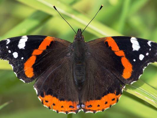 - Der Admiral fliegt ab April aus dem Mittelmeergebiet bei uns ein. Er legt seine Eier ausschliesslich an Brennnesseln ab. Die Raupen bauen sich aus einem Blatt ein Versteck zur Verpuppung (Foto: Christian Fischer/cc4.0).