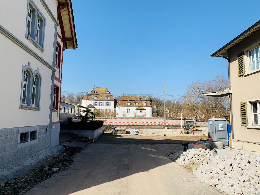 Aktuell wird das MiBo-Areal wie geplant aufgewertet. In einem ersten Schritt wurden die Garagen abgebrochen (siehe Foto). Darüber bestand bereits ein breiter Konsens aller Anwesenden der Dialogveranstaltung vom 4. November 2019, an der über die Umbauten auf dem MiBo-Areal diskutiert wurden. Damals wurde klar, dass viele verschiedene Ansprüche an das vergleichsweise kleine Gelände seitens der Bevölkerung gestellt wurden. Der Gemeinderat hat sich daher für eine Kompromisslösung entschieden, die nun realisiert wird. So wird der Einfahrtsbereich übersichtlicher gestaltet. Zudem ist eine sichere Verbindung mit Begrünungs- und Aufwertungselementen für die Füssgängerinnen und Fussgänger (ein sogenannter «grüner Filter») vorgesehen. Es entsteht eine neue Fussgängerverbindung von der Therwilerstrasse zum Busbahnhof und zur Tramstation. Im Zuge der Umgestaltung wird zudem das Stationswägli verbreitert. Die öffentlichen Parkplätze bleiben erhalten und werden um drei Parkplätze erweitert. Somit steht weiterhin Parkraum für das lokale Gewerbe zur Verfügung, und der MiBo-Platz wird gleichzeitig grüner und freundlicher gestaltet als bisher. Er lädt auch zum Verweilen ein; aufgrund der abgerissenen Garagen ist der Blick zum Weiherschloss nun freigelegt. Zudem kann das Areal für gewisse kulturelle oder gesellschaftliche Anlässe im Ort genutzt werden, wenn der Platz autofrei ist.