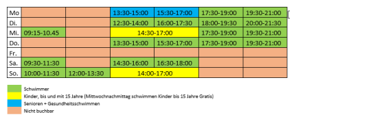 Am Montag wird die Wassertemperatur, wie gewohnt, auf 31°C erhöht. Aufgrund dessen können die ersten beiden Zeitfenster vom Montag (13.30 bis 15.00 und 15.30 bis 17.00 Uhr) nur von Personen die über 60 Jahre alt, körperlich eingeschränkt oder durch ein Arztzeugnis legitimiert sind, gebucht werden.