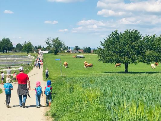 Traditionell begeht Bottmingen den Auffahrtstag mit einem Bannumgang. Dieses Jahr ist es wieder soweit: Wir treffen uns am Donnerstag, 26. Mai 2022, um 14 Uhr beim Hämisgartenschulhaus, um gemeinsam einen Teil der Bottminger Grenze abzulaufen. Der Musikverein Bottmingen begrüsst uns dort und bringt uns stimmungsvoll auf den Weg. Wir nehmen gemeinsam die Ostroute (blau) unter die Füsse, die Westroute (violett) ist zum individuellen Spaziergang ebenfalls auf diesem Plan zu ersehen. Der Spaziergang ist kinderwagenfreundlich und dauert maximal zwei Stunden. Unterwegs erwartet uns ein Team des Musikvereins, der dieses Jahr auch die Festwirtschaft betreibt, mit einer kleinen Erfrischung, bevor wir beim Fiechthag-Kreisel wieder in den Wald eintauchen und nach kurzer Zeit zum Banntagsplatz gelangen.