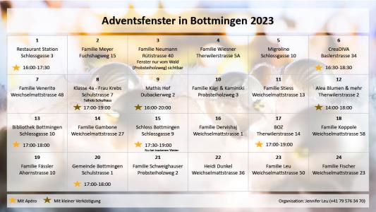 In Bottmingen werden täglich neue Adventsfenster eröffnet - heute Abend beispielsweise in der Bibliothek. In der Kalenderübersicht ist ersichtlich, wo die neuen Adventsfenster eröffnet werden und ob es an dem Tag Apéro oder eine kleine Verköstigung gibt. Die Fenster sind spätestens ab 17 Uhr bzw. ab Apéro/Verköstigung zu besichtigen.