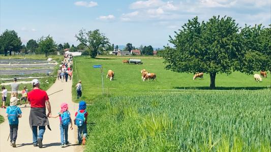 Hier begrüsst uns der Musikverein mit schwungvoller Musik, bevor wir uns gemeinsam auf den Weg machen. Der Spaziergang ist kinderwagenfreundlich und dauert maximal zwei Stunden. Unterwegs erwartet uns ein Team des Turnvereins – er betreibt auch dieses Jahr die Festwirtschaft - mit einer kleinen Erfrischung. Beim Fiechthag-Kreisel tauchen wir in den Wald ein und erreichen nach kurzer Zeit den Banntagsplatz, wo das Festzelt bereitsteht und der Musikverein nochmals ein Platzkonzert geben wird. Am Ziel erhalten die Wanderfreudigen ein Wurst-/Brotsäckchen und einen Getränkebon. Selbstverständlich hält der Turnverein auch ein gluschtiges Angebot an Essen und Getränken für Sie bereit. Mit Ihrer Konsumation zeigen Sie dem Verein Ihre Wertschätzung und unterstützen ihn finanziell.
