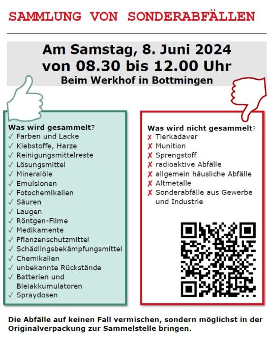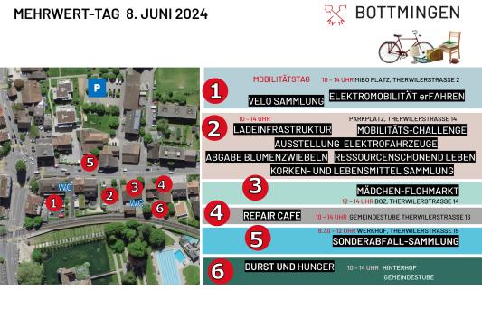 Die Gemeinde lädt alle herzlich ein zum Mehrwert-Tag 2024. Der Anlass am 8. Juni 2024 im Zentrum von Bottmingen findet bereits zum dritten Mal statt – mit einigen Neuerungen und Highlights. Am Mehrwert-Tag kann man Elektromobilität erFAHREN, darüber staunen, wie man möglichst wenig Abfall produziert, Sachen reparieren lassen, tauschen oder verkaufen. Zudem werden Sonderabfälle, Fahrräder sowie noch haltbare und ungeöffnete Lebensmittel und Hygieneartikel und Korken gesammelt.