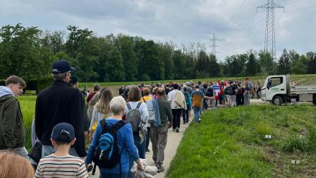 Hier begrüsst uns der Musikverein mit schwungvoller Musik, bevor wir uns gemeinsam auf den Weg machen. Der Spaziergang ist kinderwagenfreundlich und dauert maximal zwei Stunden. Unterwegs erwartet uns ein Team des Musikvereins – der dieses Jahr auch die Festwirtschaft betreibt - mit einer kleinen Erfrischung. Beim Fiechthag-Kreisel tauchen wir in den Wald ein und erreichen nach kurzer Zeit den Banntagsplatz, wo das Festzelt bereitsteht und der Musikverein nochmals ein Platzkonzert geben wird. Am Ziel erhalten die Wanderfreudigen ein Wurst-/Brotsäckchen und einen Getränkebon. Selbstverständlich hält der Musikverein auch ein gluschtiges Angebot an Essen und Getränken für Sie bereit. Mit Ihrer Konsumation zeigen Sie dem Verein Ihre Wertschätzung und unterstützen ihn finanziell. Die Festwirtschaft ist bereits ab 12 Uhr (für alle) geöffnet.