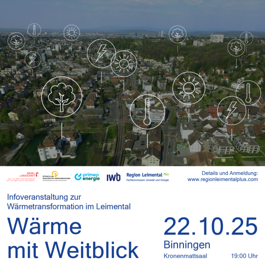 An der Infoveranstaltung am 22. Oktober im Kronenmattsaal Binningen (Beginn: 19 Uhr, kostenlos, Anmeldung erbeten) informieren Vertreterinnen und Vertreter von Kanton, Gemeinden und Energiefachleute der Baselbieter Energieberatung, von Primeo Energie, IWB, BLKB und Installationsunternehmen über Chancen und Herausforderungen der Wärmetransformation. Anschliessend Apéro und individuelle Beratung an Infoständen.