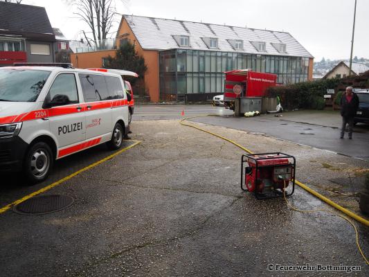 Nach intensiven Niederschlägen und Schneeschmelze war eine Baugrube dermassen voll, dass das Wasser überirdisch in Nachbargebäude eindringen konnte